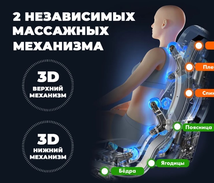 • Кресло оснащено сразу двумя 3D механизмами массажа тела