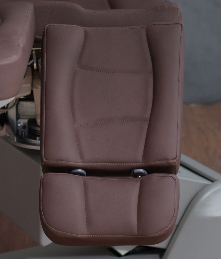 Педикюрное кресло оснащено пятью электромоторами, обеспечивающими регулировку высоты, наклона спинки, наклона сиденья и ножных опор. Кресло легко раскладывается в горизонтальное положение, образуя ровную поверхность. Надежная конструкция системы подъема обеспечивает высокую устойчивость кресла даже при максимальной высоте. Откидывающиеся подлокотники делают более удобным процесс посадки клиента. Управляется при помощи ручного проводного пульта. Дополнительно при производстве могут быть установлены различные опции.